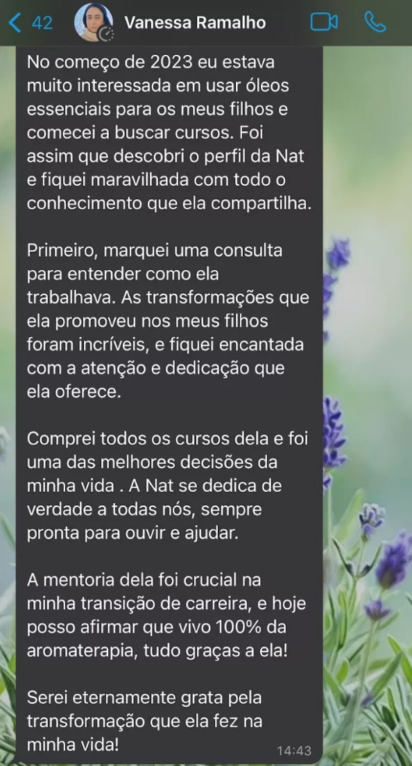 Sou aromaterapeuta há quase 10 anos, doula, educadora perinatal e mãe de uma linda criança autista que transformou minha vida e despertou meu amor pela aromaterapia.